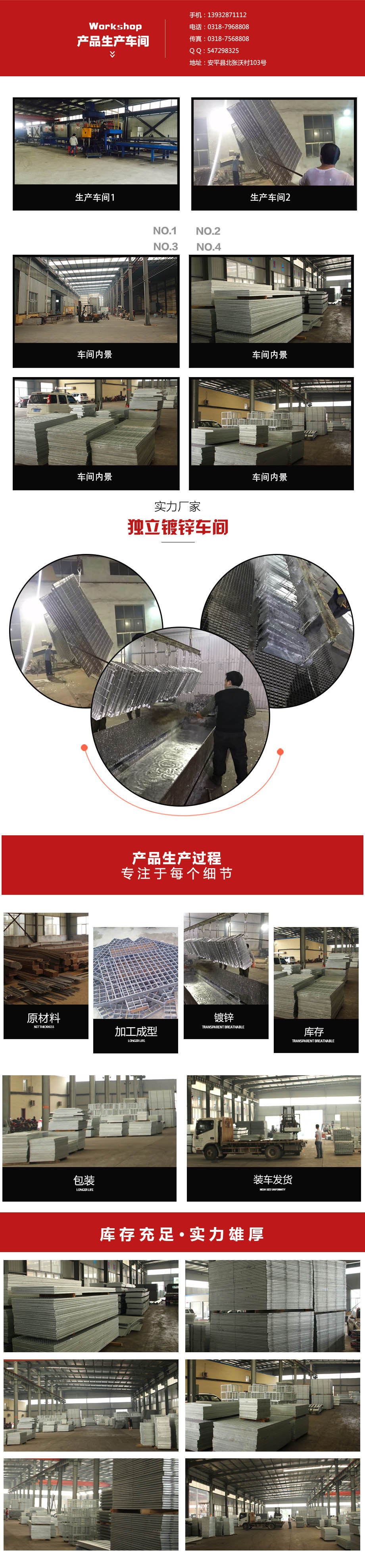 多臺檢測設(shè)備和精良的加工工藝,生產(chǎn)制造鋼格板。主要生產(chǎn)熱鍍鋅鋼格板、熱鍍鋅鋼格柵板、鍍鋅鋼格柵、鍍鋅格柵板、熱鍍鋅格柵板、平臺鋼格板、格柵板、蓋溝板、鋼格板等。廣泛用于;石油、化工、港口、電力、運輸、造紙、鋼鐵、市政、房地產(chǎn)、制造業(yè)等各個領(lǐng)域。我們集科研、生產(chǎn)、銷售、服務(wù)為一體,多年來致力于鋼格板的制作和研發(fā),技術(shù)力量雄厚,擁有成熟的工藝以及豐富的鋼格板生產(chǎn)和安裝經(jīng)驗。