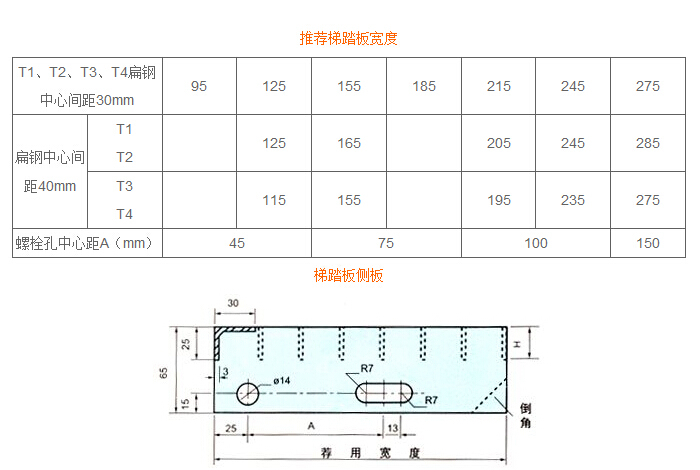 ◆ 我公司生產(chǎn)的踏步板根據(jù)有無前護板和與梯梁聯(lián)接方式有四種形式,表示為T1,T2,T3,T4。