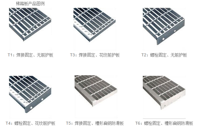 ◆ 我公司生產(chǎn)的踏步板根據(jù)有無前護(hù)板和與梯梁聯(lián)接方式有四種形式,表示為T1,T2,T3,T4。